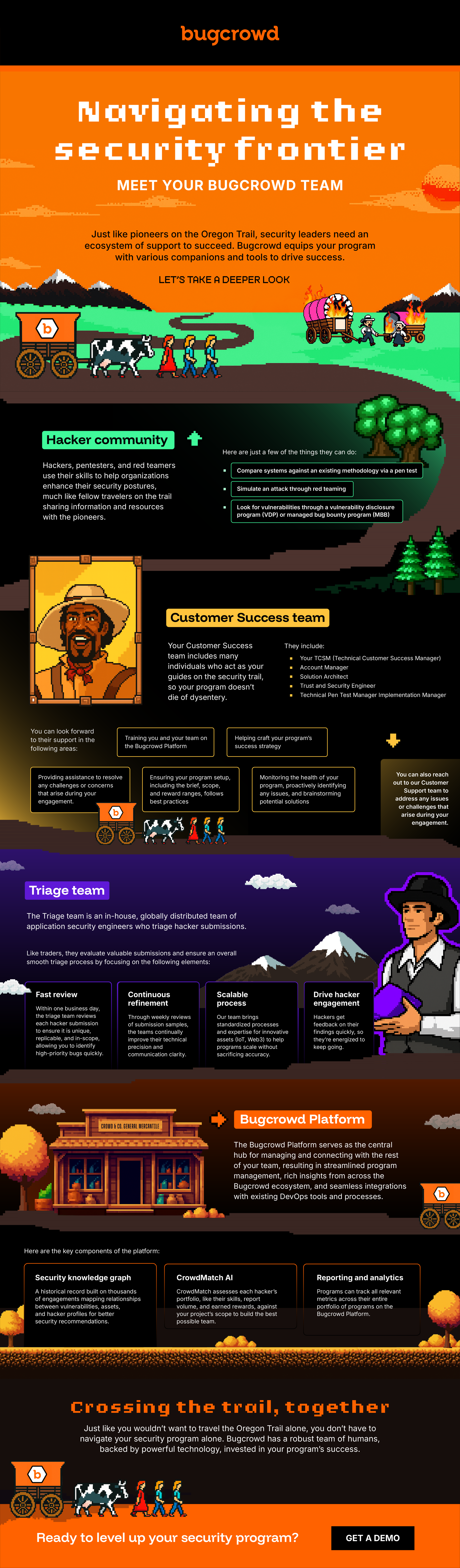 We faced this exact scenario when working with Bugcrowd on an infographic that explained all the teams that support a Bugcrowd engagement. Our idea? Use the Oregon Trail video game, a popular game from the 90s/early 2000s, in which the player must successfully guide a party of settlers across the Oregon Trail in the 19th century. "We're really proud of how this infographic turned out,” explained Erica Azad, Director of Content Marketing at Bugcrowd. “It’s a really creative idea, and allows us to highlight our differentiators.”